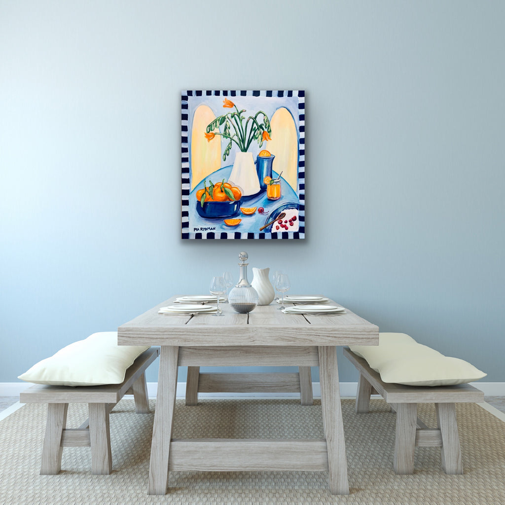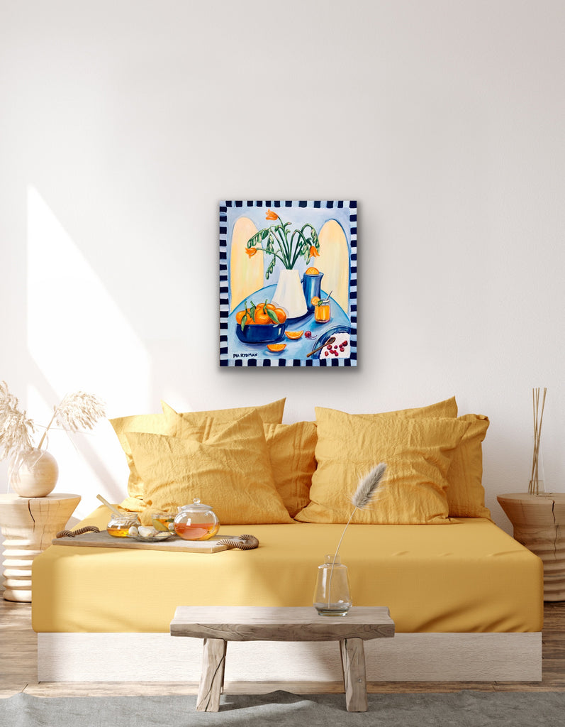 Teoksen ulkoreunat on maalattu samalla kuviolla kuin etureunan kehys. Teos on ripustusvalmis. Alkuperäinen akryyli/öljyvärimaalaus.